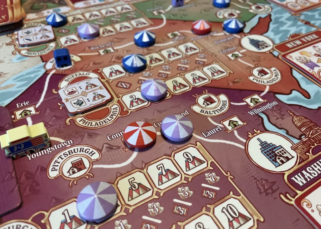 Every time any player puts on a show, the game’s metaphorical clock ticks toward the end as the non-player circus, Barnum, moves around the perimeter of the board, skipping over any destination that has a tent in it already. When Barnum reaches the big cities he’ll also trigger some bonus scoring for whichever state he’s in, giving fame points (10 and 6 respectively) to the players with the most tents in that state. And when Barnum reaches the city he started in, there’s a final scoring for that state, and then game is over.