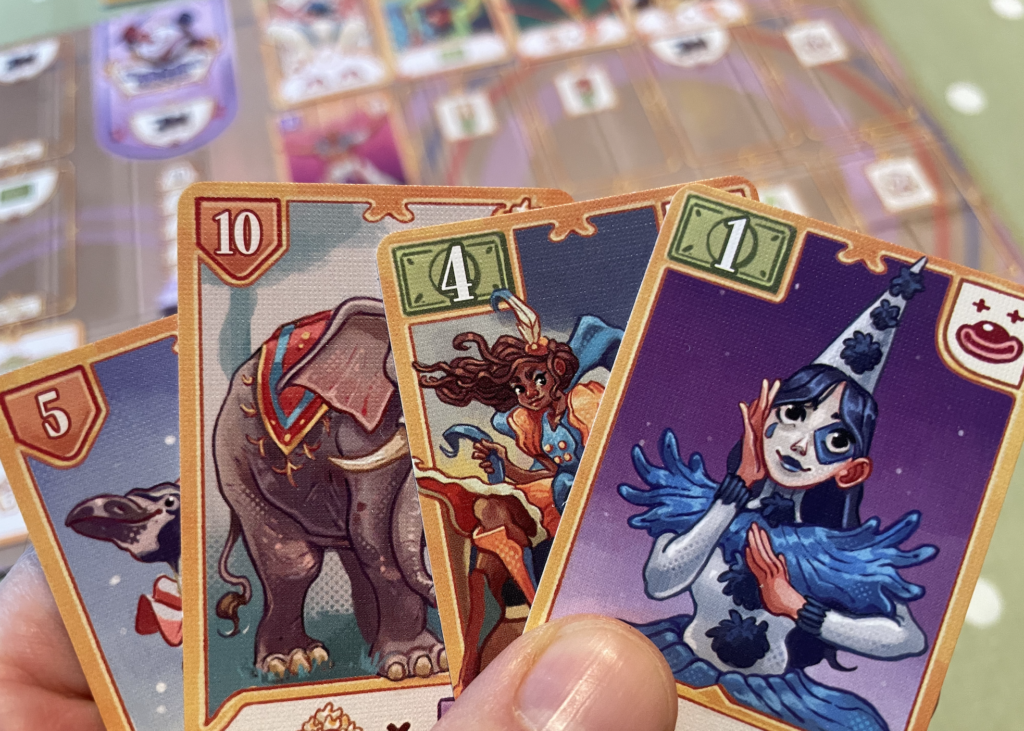 So – that’s the nub, but there are layers of complexity around it. Rewards in the cities will vary depending on how many pedestals you have in your circus: you start with a measly one, but can generate more through the addition of performers: each performer has a suit (eg animals, magicians, clowns) and each card supplies a bonus of some kind when you play it. The better performers are worth points at the end of the game: by themselves and/or depending on what other performers you have in your circus. Additionally, where cards go on your board can trigger bonuses: when you cover up a symbol, you take that symbol’s bonus: more cards, move cards around on your board, end-game bonus cards (which can only be played whenever you complete a column on your board). One exception to this extravaganza of possibly-fruitful considerations are the train symbols: the more you cover up on your board, the less far your circus can move on the map, as it grows from nascent clown-and-acrobat combo to a vast procession of visual delights.