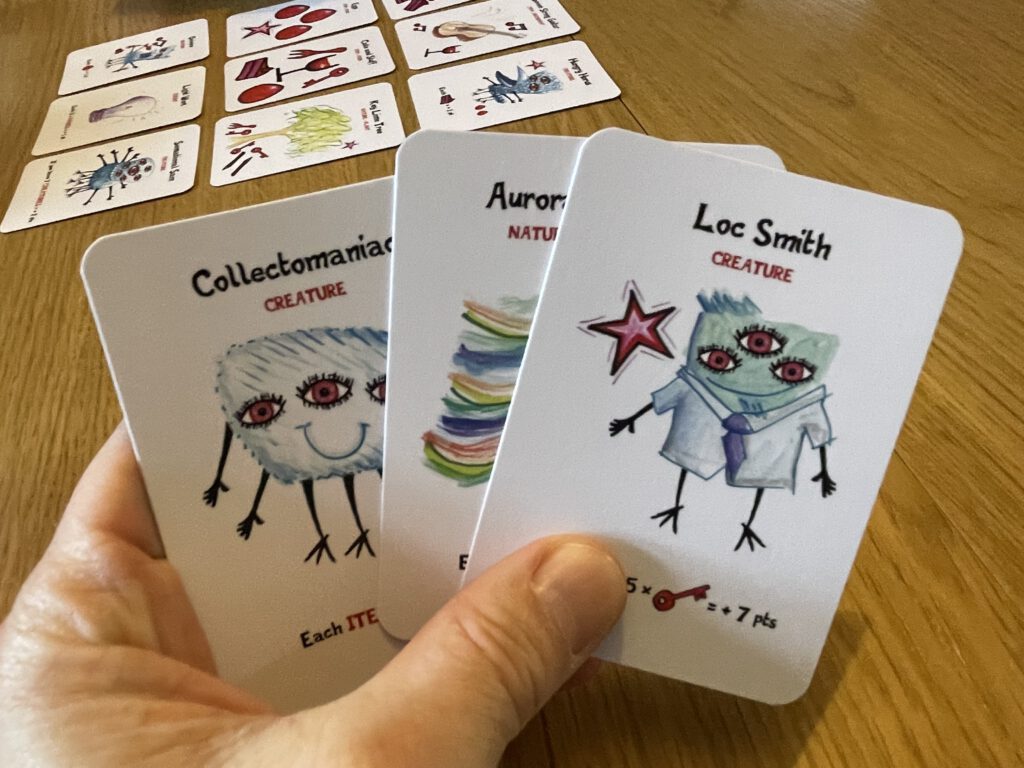 Each card belongs to a suit (eg creatures) and contains a number of elements that might score (eg plants, legs, eyes) with different cards (eg a card that says get a point for every pair of eyes). So the synergising of the title is looking for cards that combine in at least one way to generate points. Once you’ve added a card to your hand you can’t return it to the table, and as soon as any player’s stack is empty, they count down from seven to give everyone else a last few seconds to make card-grabbing decisions. Then the game is over, and anyone who still has any cards in their stack adds them to their hand, and all hands are scored.