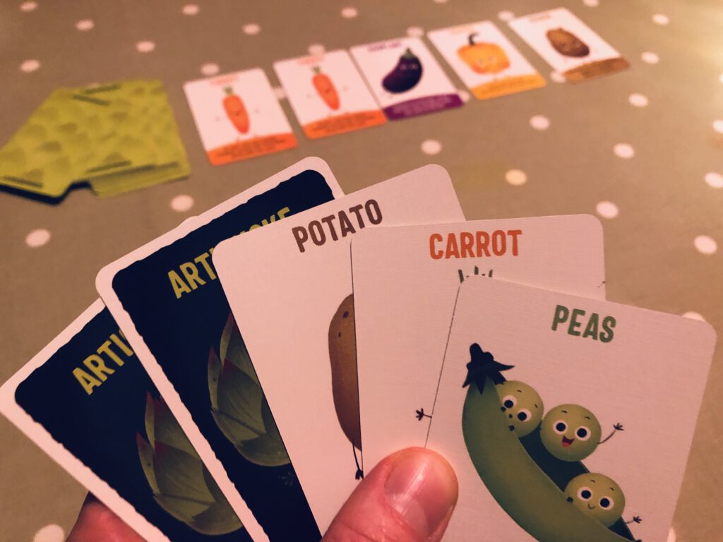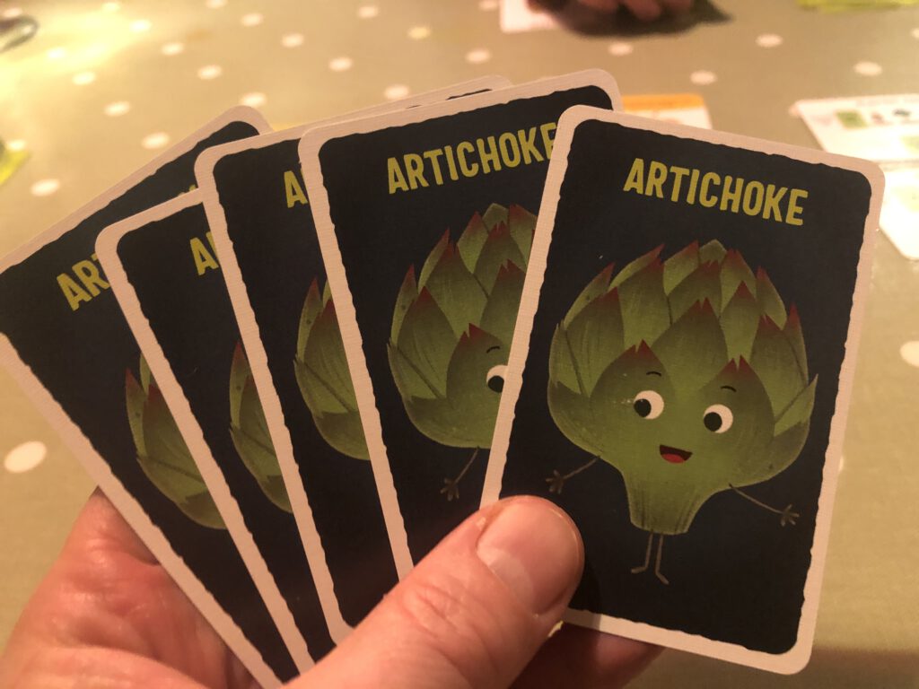Once you’ve played any cards you can, all played and any unplayed cards go into your discard pile: when your draw deck runs out, your discards are shuffled to form the new draw deck. The game continues until the moment anyone draws a hand of five non-artichoke cards, at which point they have successfully abandoned their artichokes and claim their vegetable-based victory.