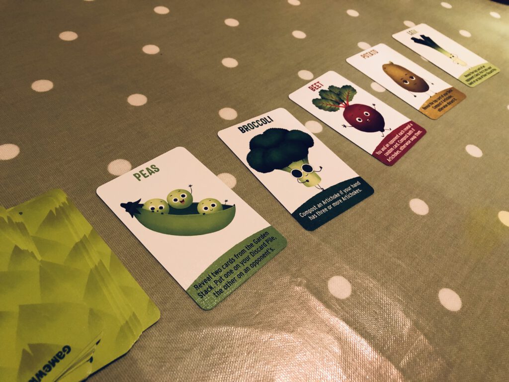 Everyone begins with ten Artichoke cards. On the table the vegetable cards (made up of non-artichoke vegetables) are placed, with the top five flipped face-up for all to see in what’s referred to as the garden row. Turns are simple: you’ll have a hand of five cards (all artichokes at the start) and you claim a single card from the row, and then play as many cards as you can from your hand. On your first time, that’s obviously only going to be one card. As the game progresses, however, you’ll get more: artichokes do nothing, of course – they’re just in your way – but all the vegetable cards have a special action they do, allowing you to get rid of artichokes in your hand (‘composting’ them) or snaffle cards from other players, or manipulate your deck in some way to try and maximise the chance of drawing a hand of five non-artichoke cards.