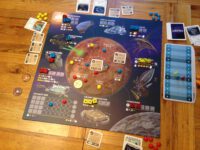 The central idea of Alien Frontiers – roll dice, place them – is great. The addition of cards that give extra powers as well as the powers awarded for controlling regions on the planet can make the game a little convoluted, especially as you can’t really plan ahead with complete certainty. What starts out as a fast-moving game of chucking dice and implementing their rolls begins, in our experience, to get bogged down in the procedure of resolving the effects on the cards, particularly if one or more players has really gone that route in a big way. We’ve played before without using the cards and substituting something else for that space – it’s maybe not as intricate a game then as the designer intended, but it certainly moves a lot quicker and for kids especially that worked a treat. As it stands though, recommended with caveats.