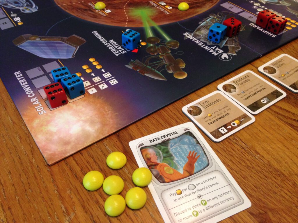 Every player begins with three ships (three dice) and on their turn they roll their dice and choose where to assign them on the board. The facilities do various things – you can grab the key resources of solar energy and ore, which in turn can be used to build a new ship (each player can have up to six in total), you can sacrifice a ship to place a settlement, or pay ore to build a settlement outright, you can even steal resources from each other… Certain facilities require a pair of the same number; one requires three of a kind and one requires a ‘straight’ – without these numbers on your dice, you can’t make use of that facility.