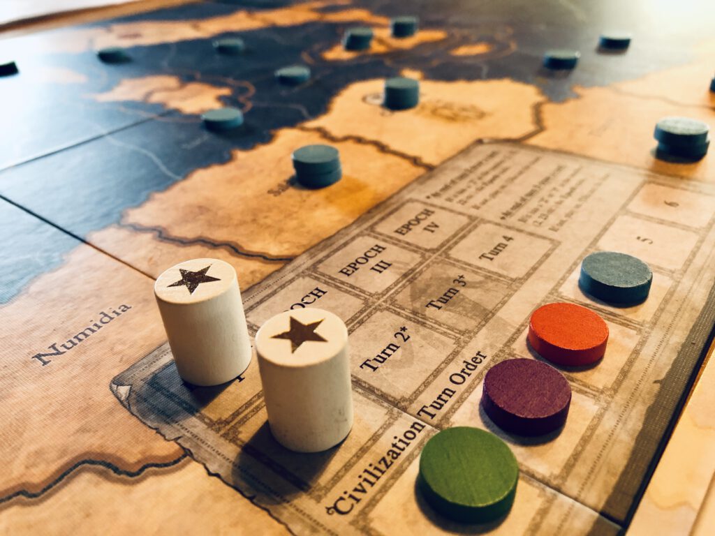 However! Players may play competition cards here to assist them, and as in the Card Phase, may discard cards or spend money to avoid removing a disc, meaning although the system is straightforward the result of each battle is less so. When all contests have been resolved, the final phase begins: the Reckoning phase. Here players score points (for cities and wonders) establish turn order (most cities goes first; fewest last) and draw cards for the next turn. After four turns, there is an End of Epoch scoring and all cards and money discarded. After four epochs, the game will end…