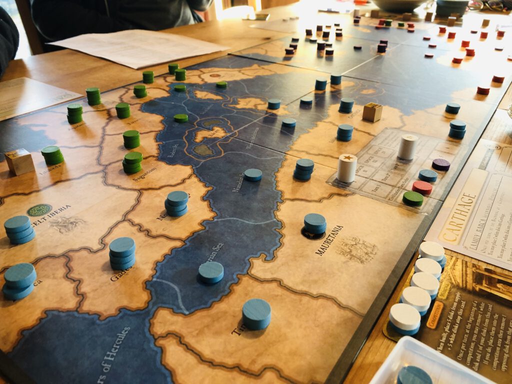 The large board shows the sea itself and the regions around it – north Africa and southern Europe. Everything is broken into areas, although how much of the board to be fought over depends how many players there are, as with fewer people some areas will be off-limits. The goal of each player is to score points by building cities and wonders, but these theoretically-peaceful pastimes sometimes get shelved in favour of expansion and aggression, as you seek to prevent others from doing the same.