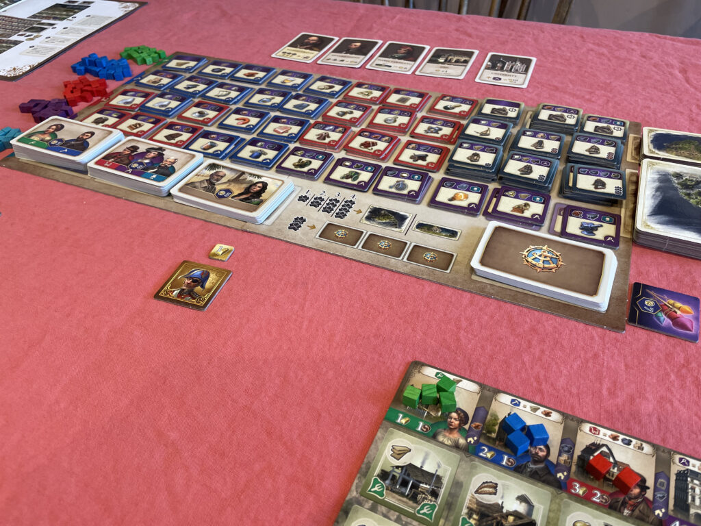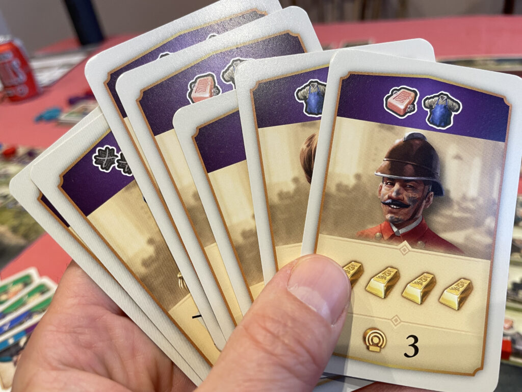 There are some other things in the mix: you can upgrade workers (eg change a farmer to an engineer) change cards, collect Expedition cards for additional points, and each game also has five distinct possible end-game bonuses (Leader cards) that vary from play to play. But the heart of it is the idea of improving one’s lot; working through a sort of microcosmic revolution of industry on your own island. The game ends when any one player plays their last card (there’s a bonus for doing so) before scores are tallied from your played cards, Expeditions, and Leader bonuses.