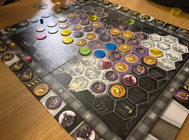 It’s a bit of a shame Ape Town’s presentation is – to me – rather uninviting: the monochromatic board, the tiny numbers on the ape tiles. They’re not dealbreakers, but I think it’s such a good game that the visual design doesn’t match up to it. I’m a big fan of this designer Reiner Knizia and I like his relatively simple rules + high levels of interaction. I wouldn’t argue you feel like an ape gangster – whatever that is – or that Ape Town is a bundle of laughs. Like Knizia’s Babylonia and others, the joy to be had here is in the tactical battle: the spotting of opportunities to cannonball yourself from a narrow last place to a narrow lead. The dynamic scoring – it happens as you play, not at the end of the game – is a key part of this too. It’s probably a little too abstract to resonate with theme, but as a feisty battle for dominance, it definitely ticks the boxes.