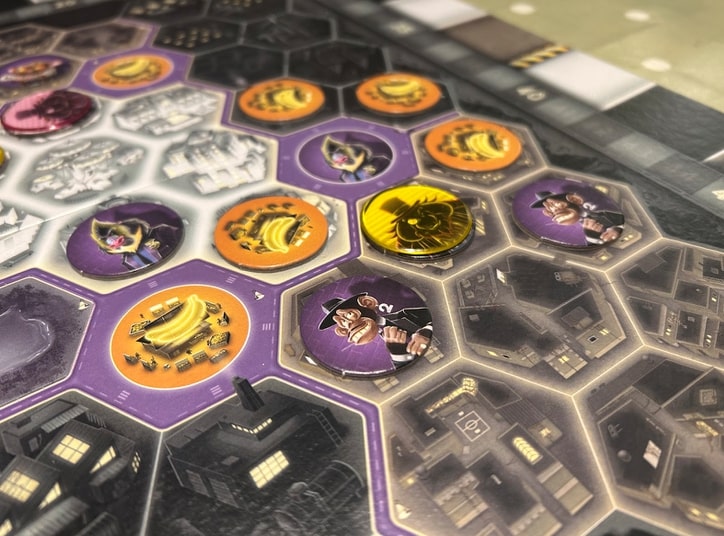 There are four different kinds of tile: apes, bananas, orangutans and lemurs. The tiles are placed around the edge of the board and the next one in line is always free to take: if you want another further along, you pay cash to every tile you jump past to reach it. Once you’ve chosen, you place the tile on the board… although there’s a crucial catch: the spot the tile was taken from always has a colour (black/white/grey) and the neighbourhood you place it in must match that colour.