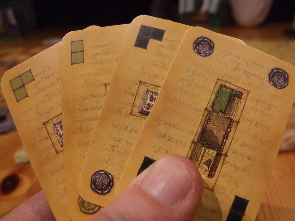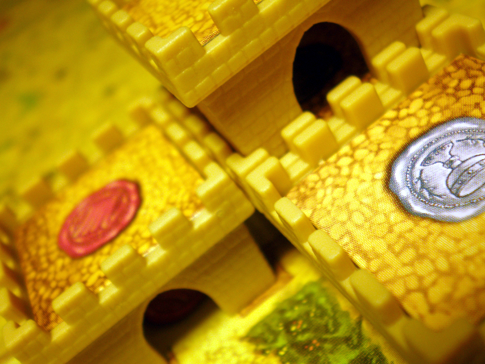 But wait – each tower added to the castle also shows a seal colour, and the value of the seals depends on how many seals are visible in the castle when you choose to cash in. So both the timing of cashing in your seals and the placement of towers in the castle is crucial, both in terms of increasing your own seal value and hampering your opponents’.