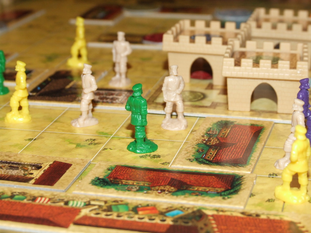 On your turn you can either play a card and place a building on the board – adding a seal of a particular colour – or place workers. Both buildings and workers must go adjacent to the castle, or to previously-placed buildings and workers. As soon as a building is surrounded, the player whose turn it is collects the seal on the building, and adds a tower to the castle in the centre of the board – so your principle aim is to collect seals. Four times during the game you can cash your seals in, and generate some extra workers into the bargain.