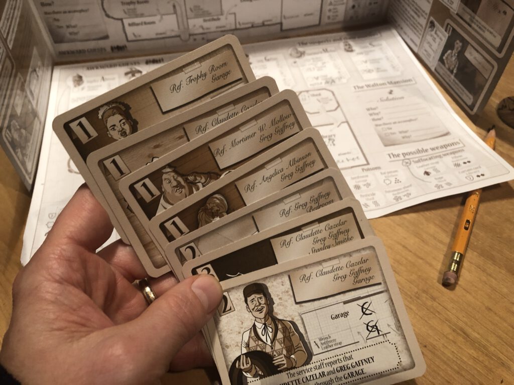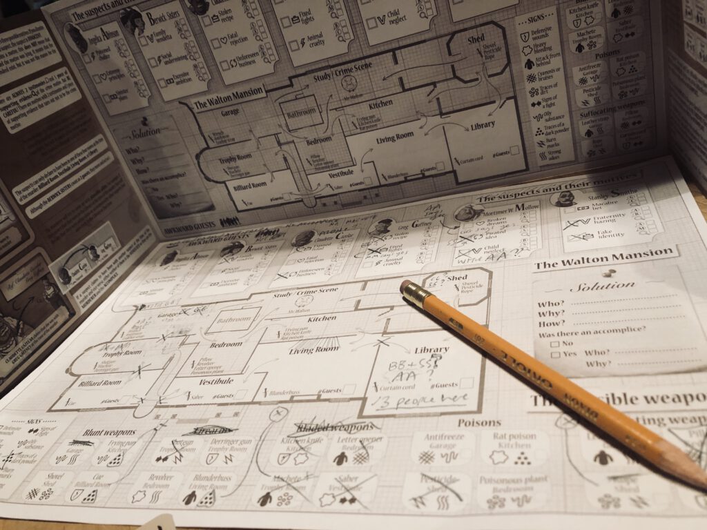 Mr Walton has been murdered, and there are six potential suspects who were all present in the manor when he died. You must now deduce who committed the crime, the motive, weapon, and -in the advanced game at least – whether there was an accomplice. Not only that, but what the accomplice’s motive was!