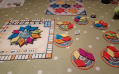 Each player has their own board, upon which you will place tiles over the six rounds of the game. There is an additional scoreboard that also hosts several bonus tiles. In the centre of the table are placed a number (how many depends on the number of players) of factories, laid out in a circle. Four tiles are added to each factory at the start of every round, and the ‘1’ tile goes in the middle.