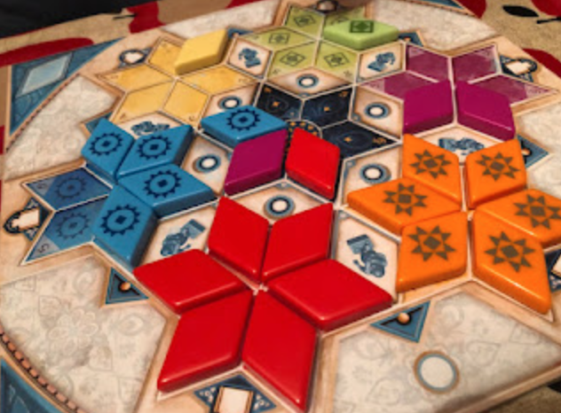 Once all tiles have been claimed from all factories, players then take turns adding them to their boards. Tiles must be placed on their matching colours, and you’ll notice that each space has a number on it: this is the number of tiles you must ‘pay’ to put a tile there. A one is simple: plonk the tile down. A six means paying five tiles of the matching colour (or wilds) into the game’s tower (- its only function is to collect tiles) and placing the sixth on your board. There’s also a central star with no colour denomination: all colours can be placed here, but crucially, only one of each. As you add tiles, two things happen: firstly, every tile added scores itself (1 point) plus every connected tile in the same star (up to 6 points). The other thing that occurs is bonus tiles being triggered: when you surround bonus spaces they activate, and you can – in fact, you must – collect extra tiles from the display on the scoreboard.