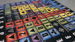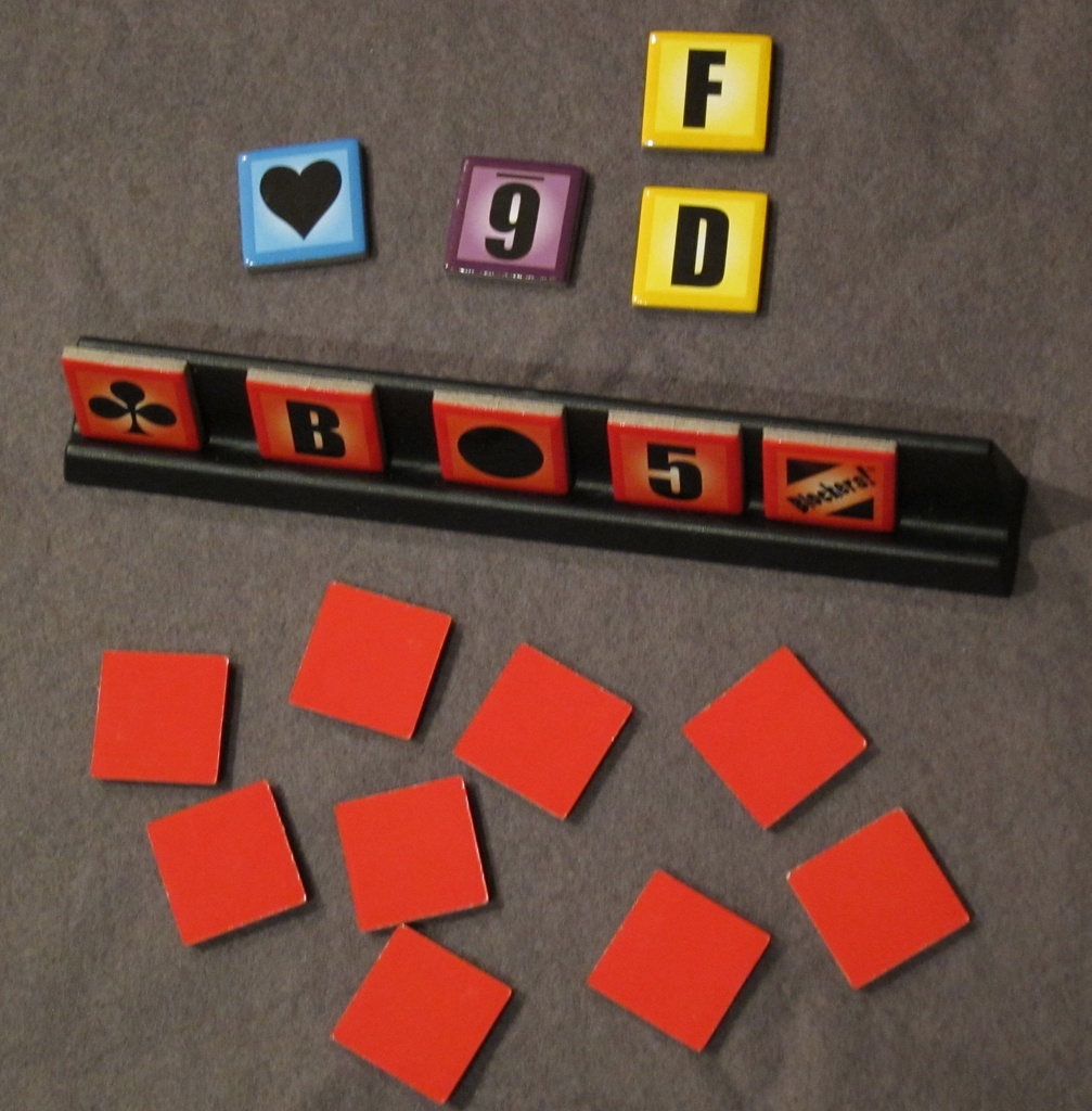 Each player is given a set of coloured tiles which show either a letter, a number or a symbol on it. These are shuffled face-down and then each player puts five of them on their individual tile racks.