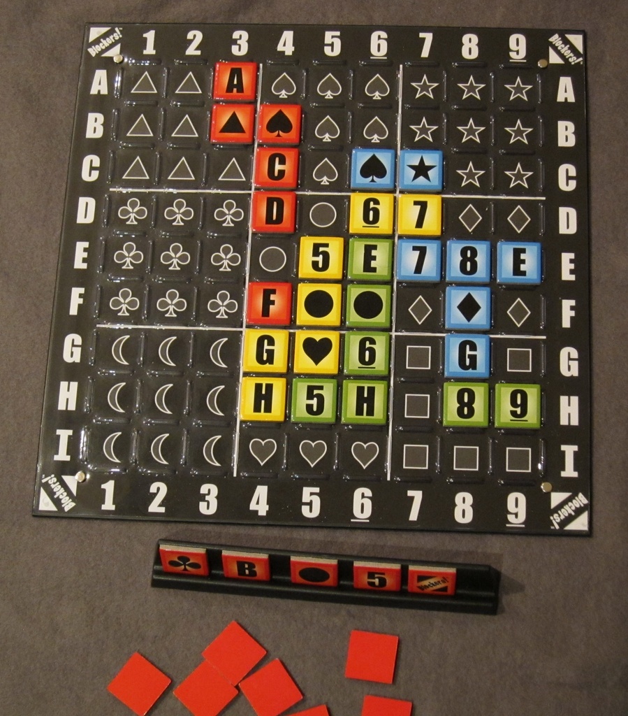 The board itself is a grid – with horizontal lines denoted by letters, vertical lines by numbers, and each individual square showing one of nine different symbols. On your turn, you simply place one of your tiles in one of it’s legal placement spots – matching its number, letter or symbol on the grid. Having done so, you add a new tile to your rack from the face-down draw pile. In terms of rules it couldn’t be much simpler.