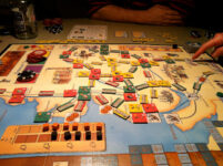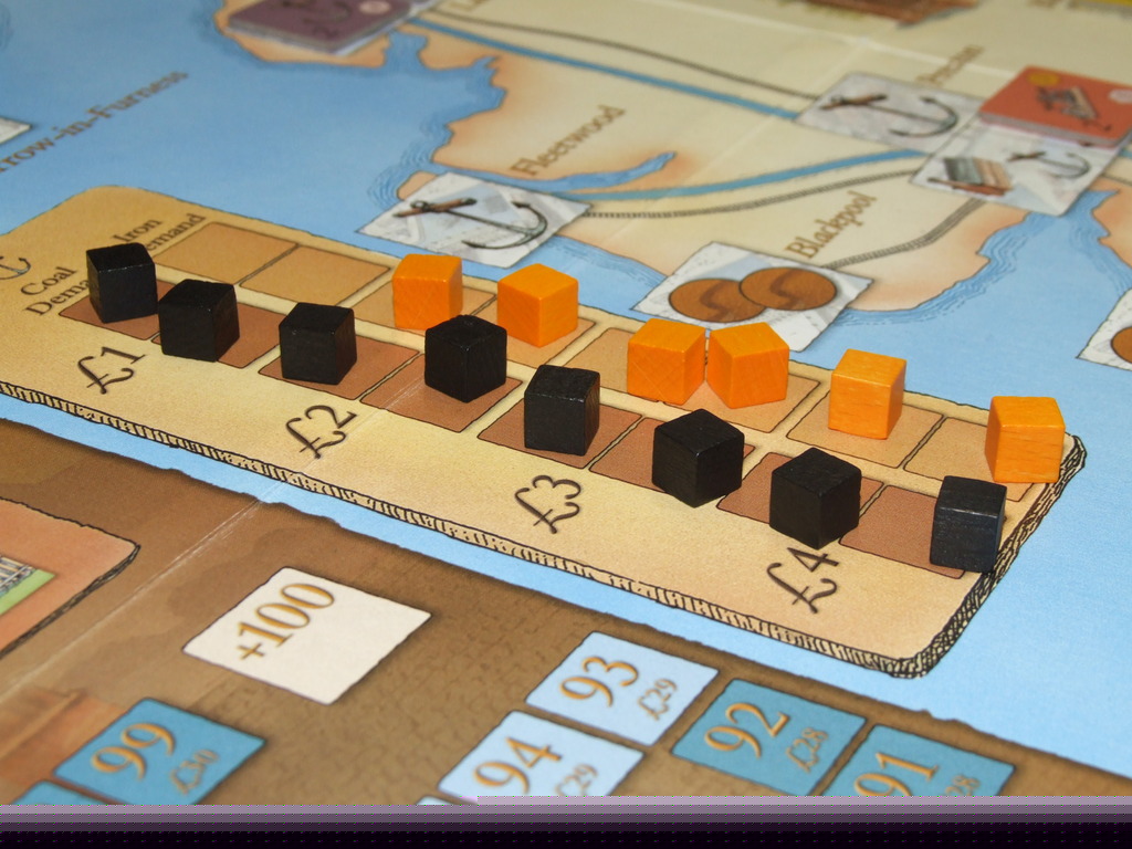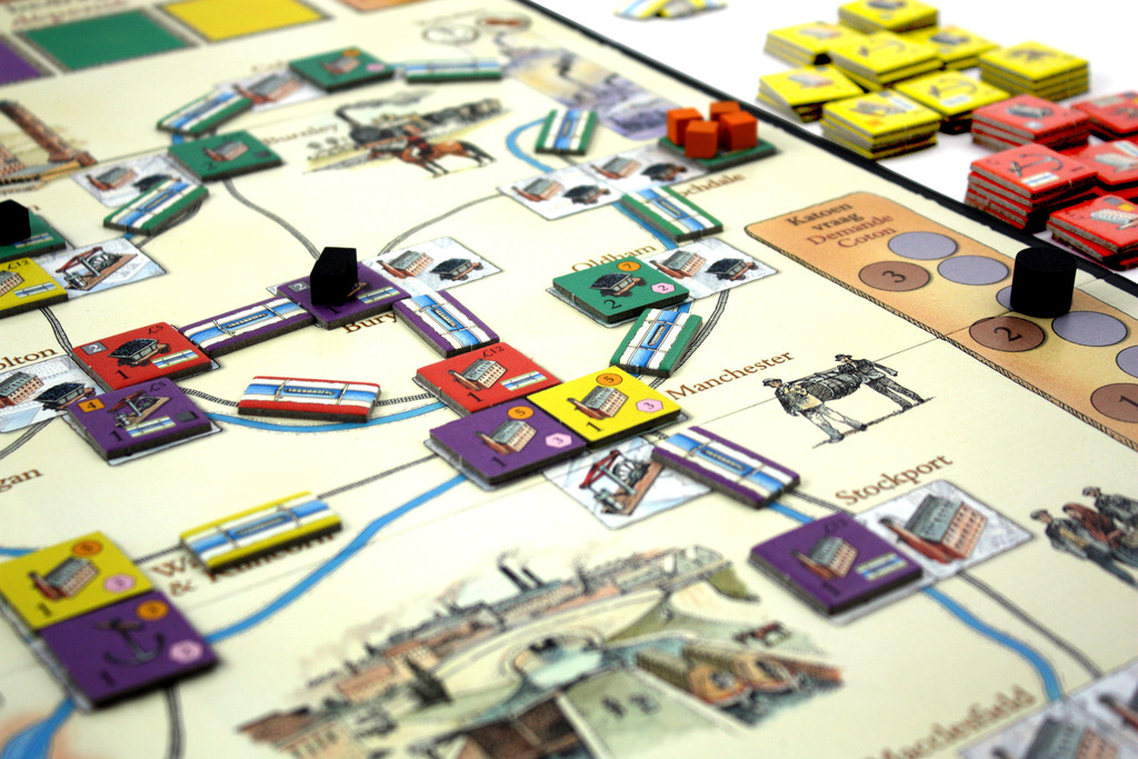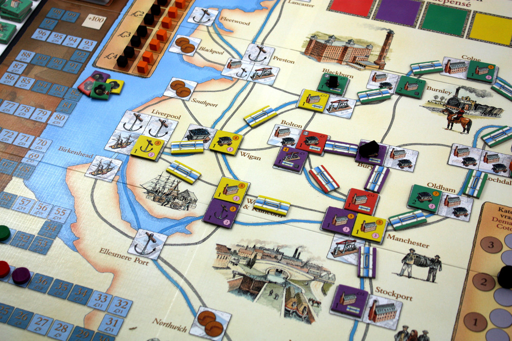 The board – a map of the north of England – starts out empty but becomes more crowded as the game goes on, and options become fewer. It’s impossible to give a brief overview of the rules here – there are several choices on each turn – but the game is very thematic: it really feels like an accurate representation of the time, from the aims of each player to the rather prosaic looking game pieces.
