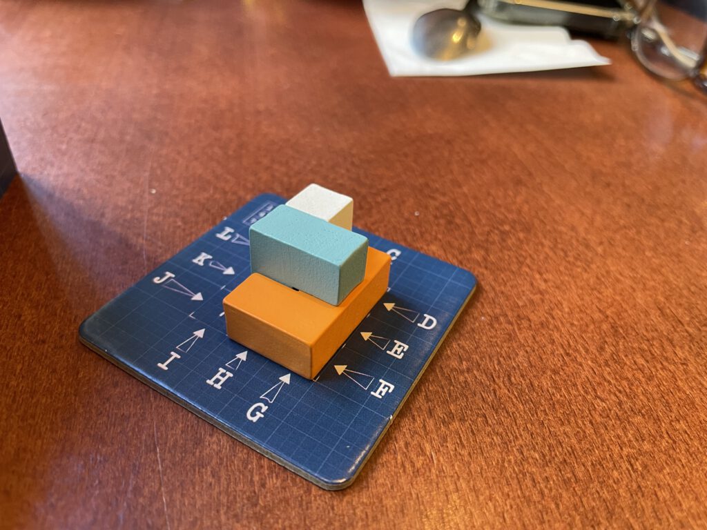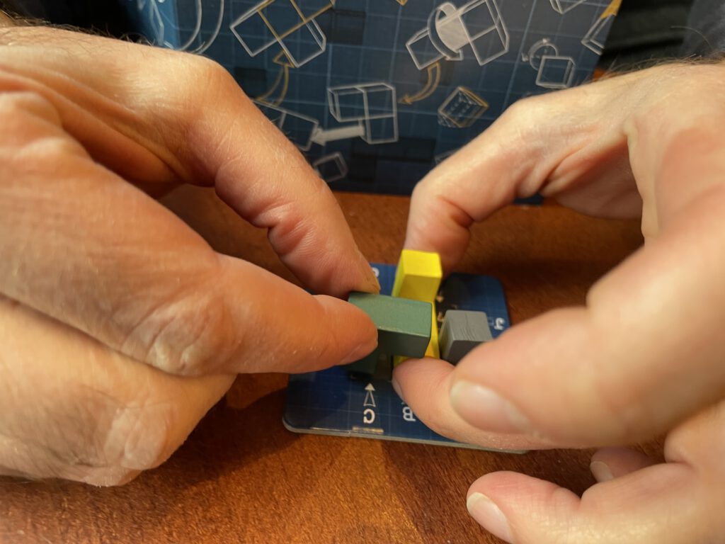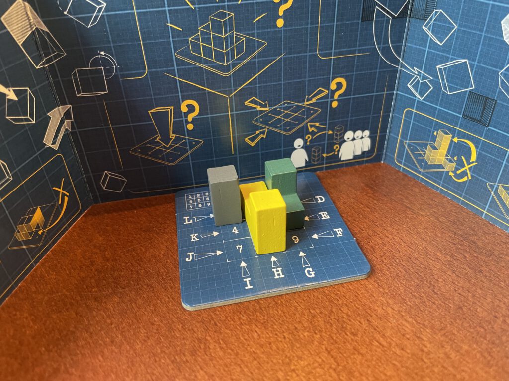 You have another grid too, which we’ll call grid B, and pieces matching your neighbour’s. Whilst the player to your left is trying to work out where you’ve placed your blocks, your goal is to work out what the player to your right has done. On your turn you do one of three things: you can ask what your opponent sees when they look down at one of the nine numbered squares (you’ll learn the colour, but not the height) or you can ask what they see when they look along one of the grid’s lettered corridors (where you’ll learn the colours and height, but not the precise location in terms of distance). The catch with the latter option is that you too, must reveal the same information to the table, which will be of great interest to the player on your left!