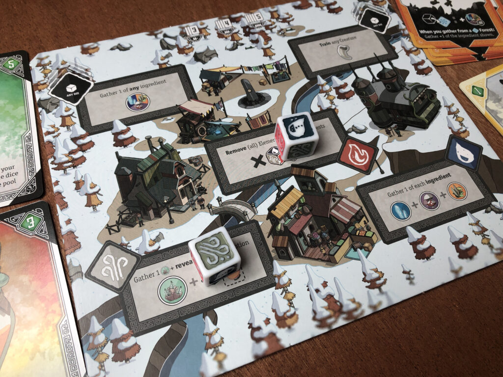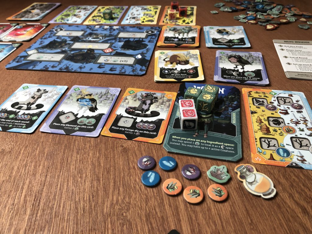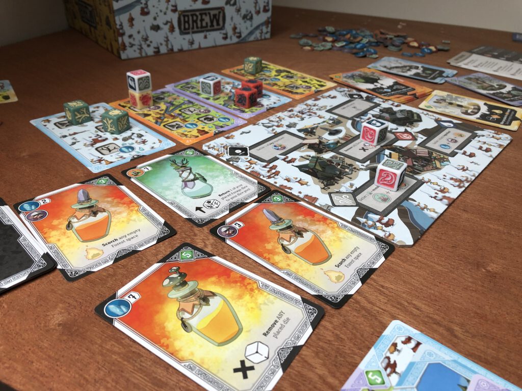 There's several forest cards to compete in with several actions in them. Mix in the Village board, available animals and potions, and there's a reasonable amount going on. Fortunately the fate of your dice rolls help downsize the decisions to something more manageable!