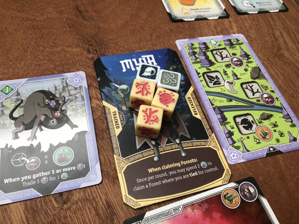 Each space in a forest allows you to place a die there and either collect resources (mushrooms, crystals, flowers) – take the resources from the supply – or train an animal: take any face-up animal card into your possession. All animals come with a special ability you can now use, potentially for the rest of the game. Instead of placing a die into a forest card, you can also place it into a village space and take the action there instead: these are rather good, and some spaces can even be shared, but ideally you want to be putting dice in the forests if possible…