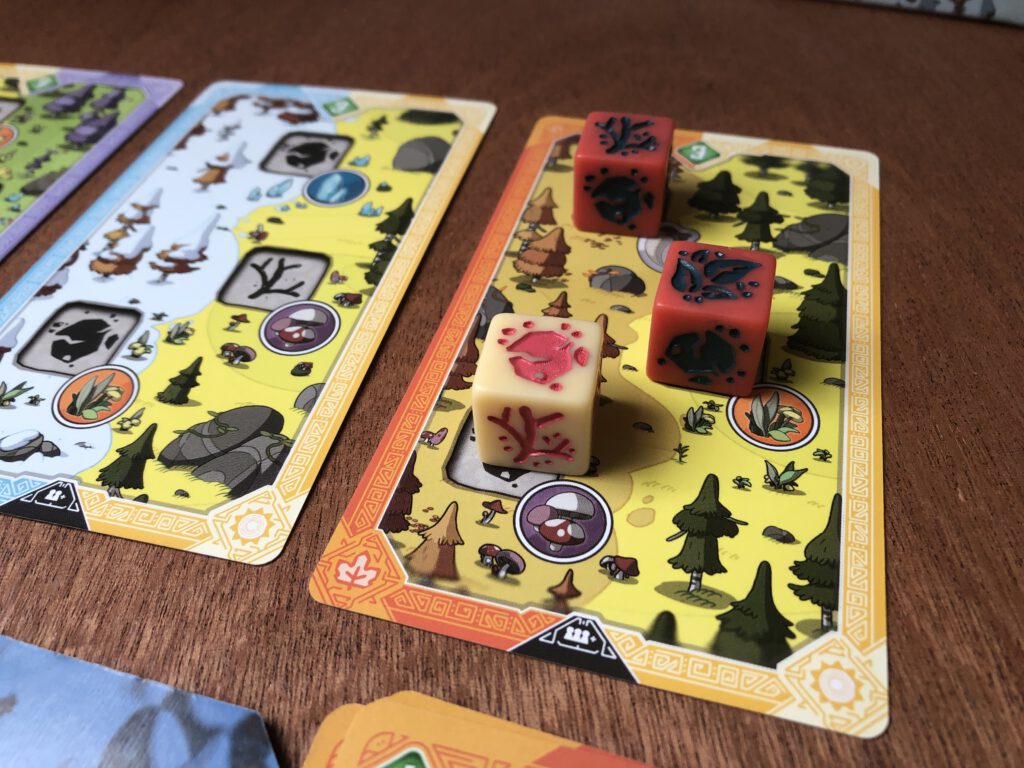 Each forest card represents a season (sometimes two) and this can be helpful for your animals. You can only ever have three trained animals, so if you pick up a fourth, one must be released. The animals have seasons too, and if your released animal matches a claimed forest card’s season, you get to flip it over: it’s now worth 3 points instead of a measly one.