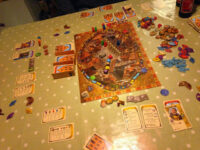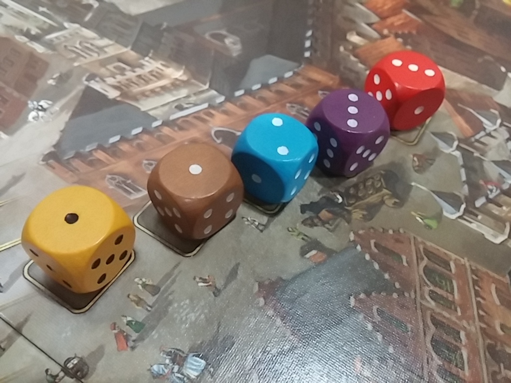 The dice rolling decides three things – any of the five coloured dice showing ones and twos determine how much players have to pay to move up on the reputation track, which is essentially a way of scoring points (there are several others). Any dice showing fives or sixes herald potential disaster – each player takes a disaster token of the matching colour/s, and accruing three of the same type of disaster means you get hit with a penalty. Finally the dice can be used to get money, which occurs during the next phase: playing cards.