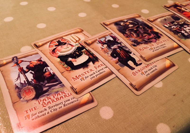 But about a quarter of the deck is made up of scroll cards, which only score after the fourth and final round. These reward in a variety of ways (for a particular resource; a number of fiefs; and certain type of territory under your control, et cetera) and when chosen, each player keeps them hidden until the end of the game. Come the final count up, they can provide huge haul of points and catapult a lagging bunny into the lead…