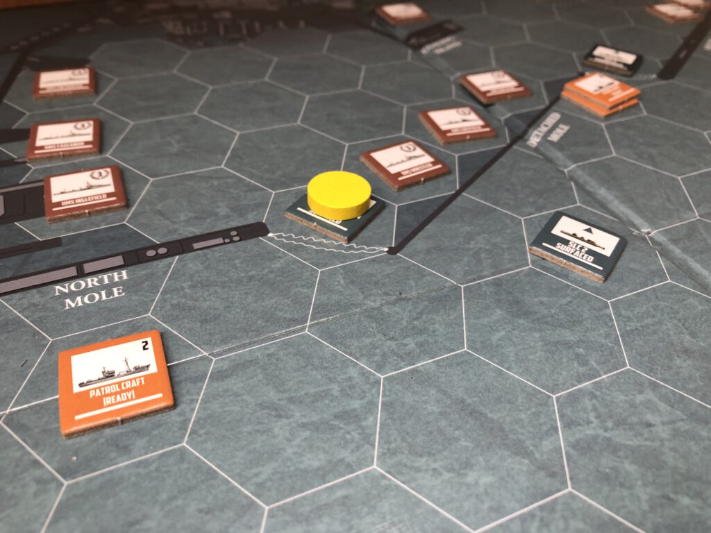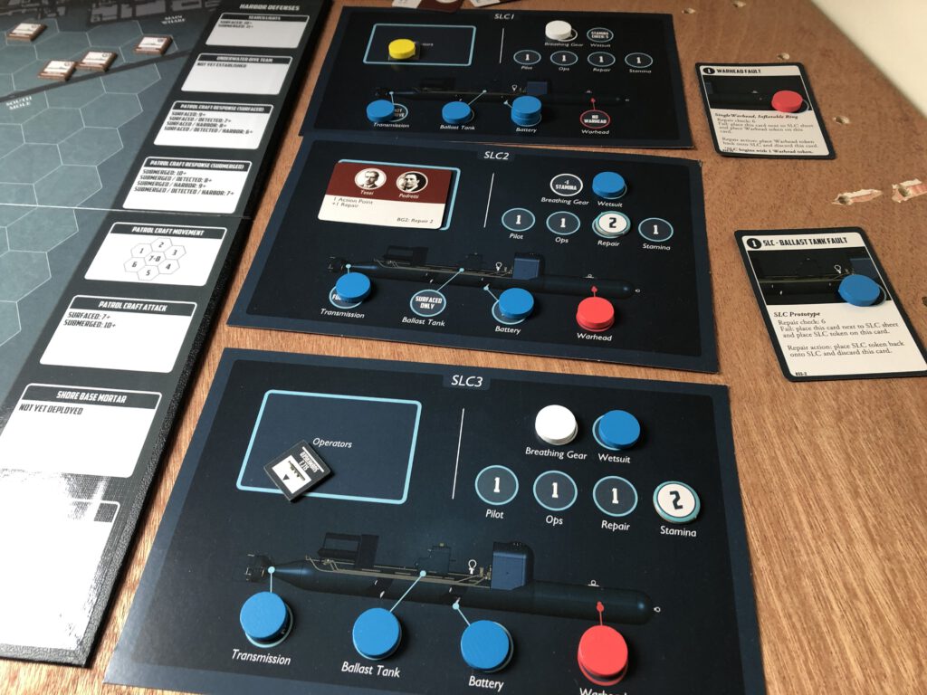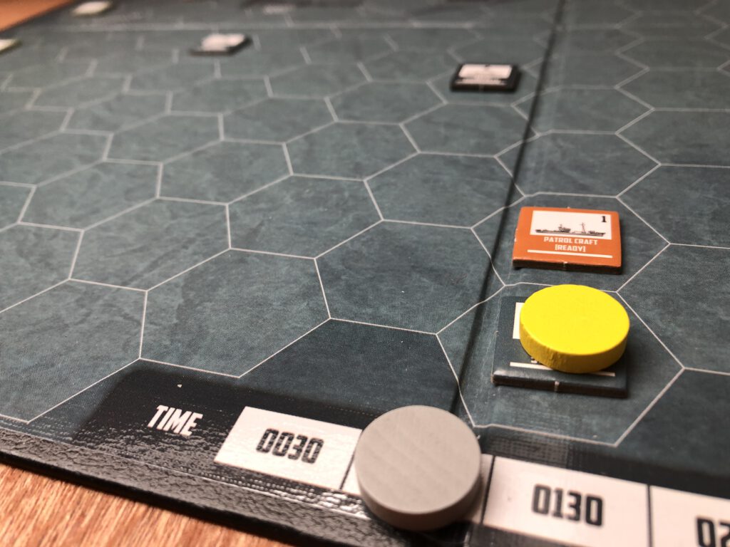 Gameplay is a combination of dice and cards, with the odds stacked against you on both. Each round represents an hour of ‘mission time’ during which you move your subs across the board (broken into hexes) to try and get them to the targets. But as simple as that sounds there’s a veritable cascade of things going wrong: the various component parts of the sub, the floodlights sleeping the water, the patrols sent out to find (and attack) you. Everything in the game screams risk – not just in the external threats, but how you manage them: everything you do costs you action points, and each torpedo gets a paltry two to spend in every turn. You can guarantee success on certain actions by spending both your available points – or, you can gamble on success by spending just one of them and rolling a die for success instead. This latter route is a tempting way to push on in a mission where time is fast slipping away, but it can often be the path to catastrophic failure as well. Your torpedoes need to dive, surface, steer, accelerate: and close the distance between themselves and the target. When you keep rolling duds and various constituent parts of your equipment is failing – well, By Stealth and Sea can feel brutally punishing.