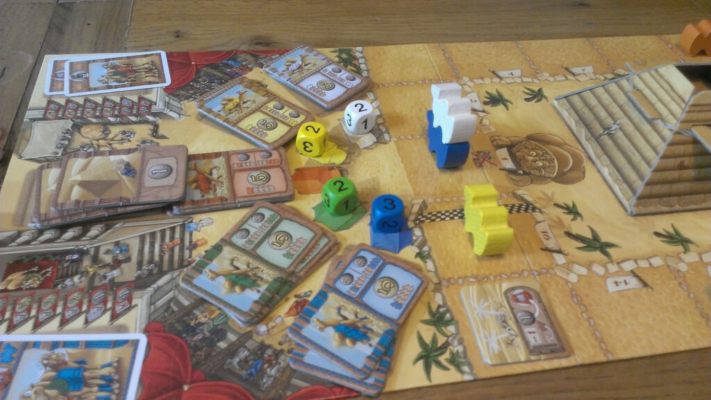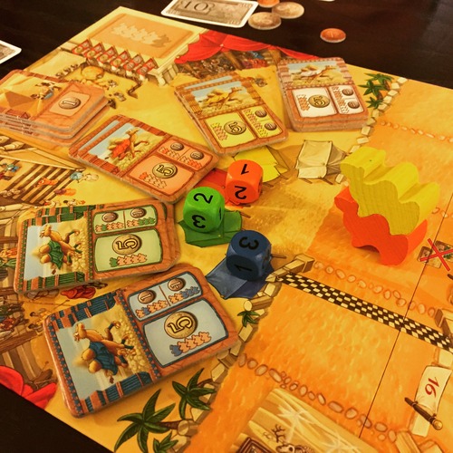 If a camel lands on your desert tile you get a pound, and you also get a pound for moving the camels, which are propelled forward by dice, that get removed one by one from a nifty pyramid on the game board.