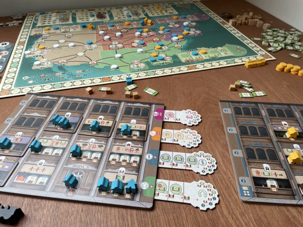 There’s much more to be said about Carnegie, but without the board and pieces in front of you this description would run out of trail. But what’s crucial to note is that when you choose an action, all the players get to activate it: so Carnegie, as well as being a machine of many moving parts, also offers some rather passive-aggressive interaction. Taking the turn that isn’t best for you might actually be the best move if it’s rubbish for someone else, whose offices are empty for instance. After 20 rounds the game will end and players score points in a few different ways, but most of all their built-network on the map and donations made in the donation chart. The player with the most points wins, and is called Andrew for the remainder of the evening.