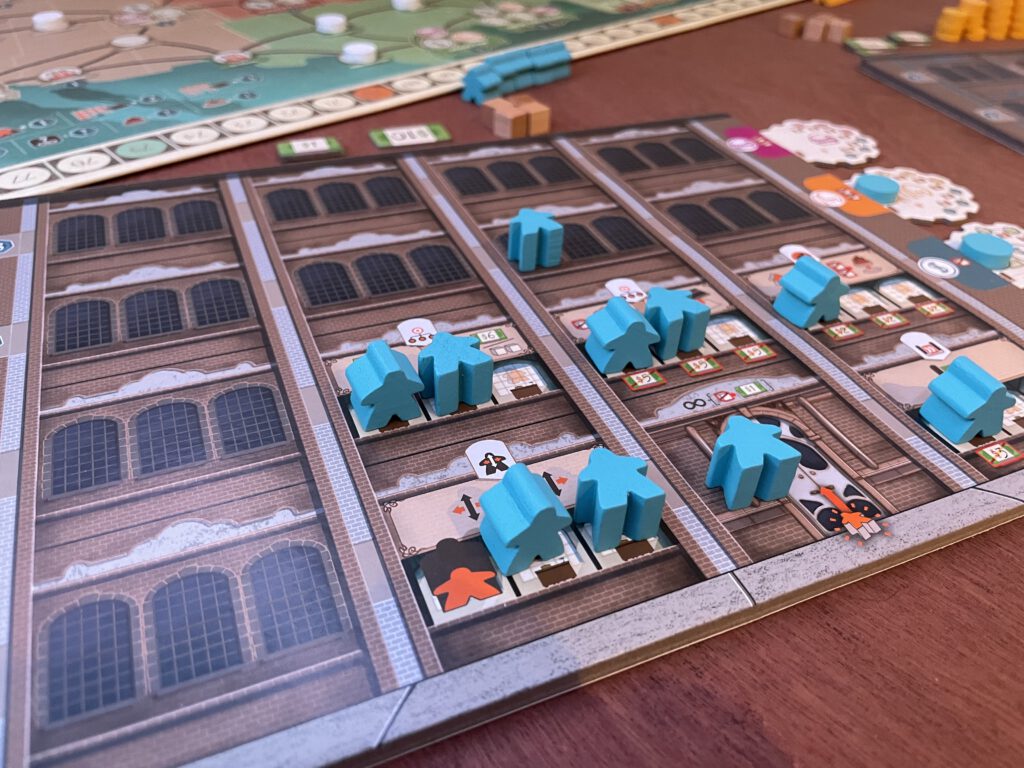 The meat of the game is phase three: using departments. Every office in your company that matches the current timeline marker will activate, as long as there is at least one worker. Human Resources offices allow you to move workers around to where you need them in the building. Management gives you avenues of sending off workers to generate cash or goods cubes. Research & Development lets you develop projects: literal tabs that slide out of your factory, generating future opportunities for building and wealth. And Construction lets you realise those projects: placing workers out on the map and constructing the projects on the map. This last option is critical in both getting workers on the map (for income later) and improving your income as you build even more projects.