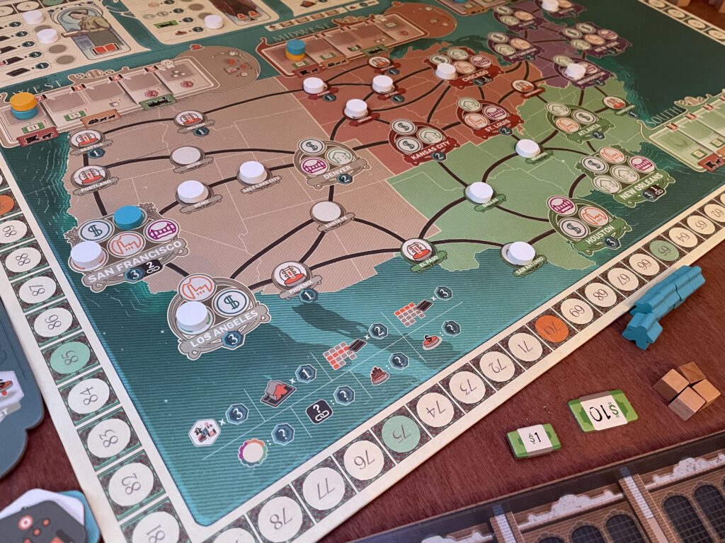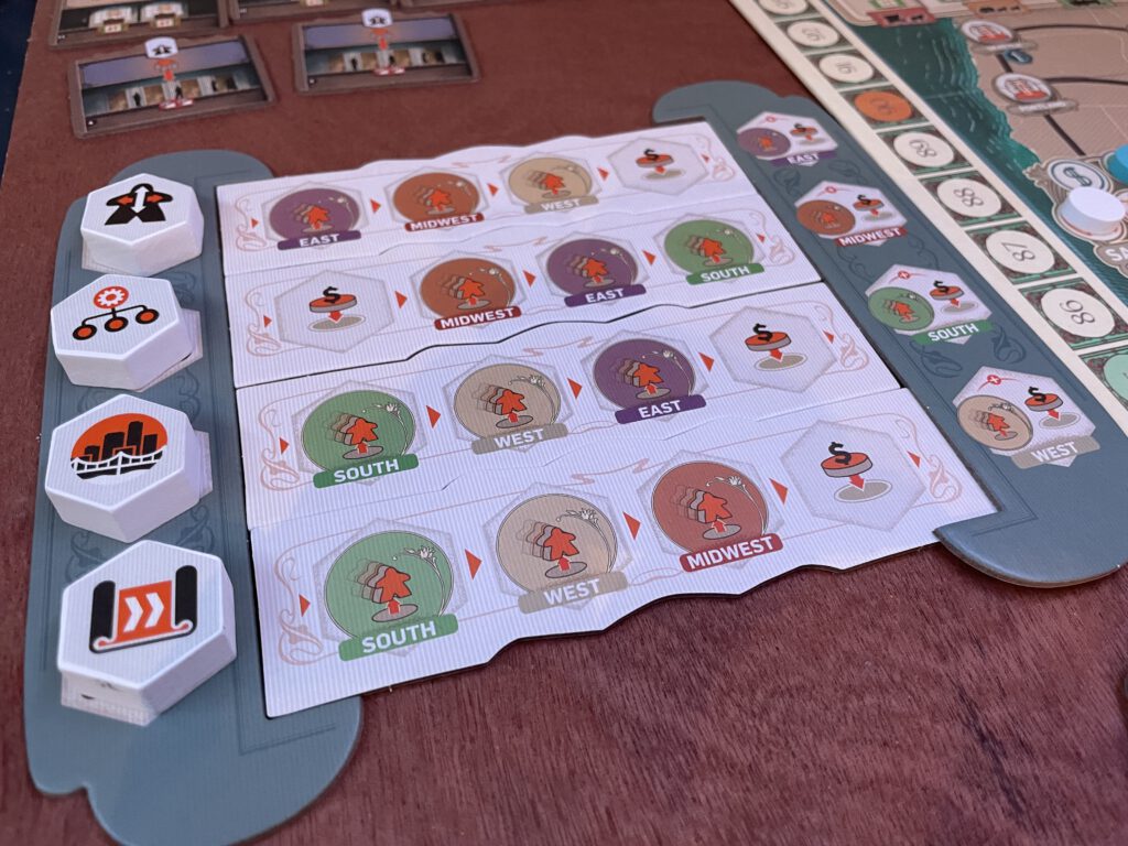 The main board shows a map of the USA, with four principle cities (New York, Chicago, San Francisco, New Orleans), several major cities and some minor ones, all connected by routes. Your primary objective is to build projects in these cities, and try to create a network of connections between your projects that incorporate the major cities. Do that, and improve how they connect (the default connection is by cart, but you can speed things up with a stagecoach, and then a railroad) and you have a sense of what you’re attempting to do. Another board, made up of randomised timeline tiles, has four markers on it representing different departments: Human Resources, Management, Construction and Research & Development – and each of these relate directly to the offices on your personal company board, which is populated by workers. On your turn, you’ll follow the four phases of each round.
