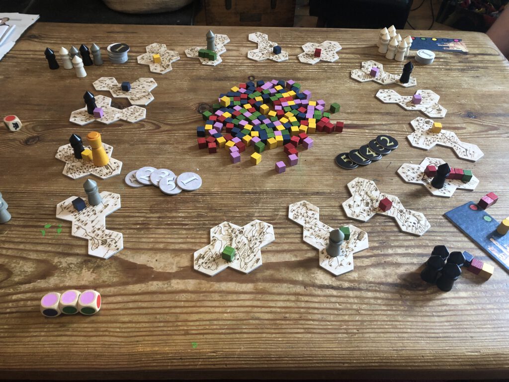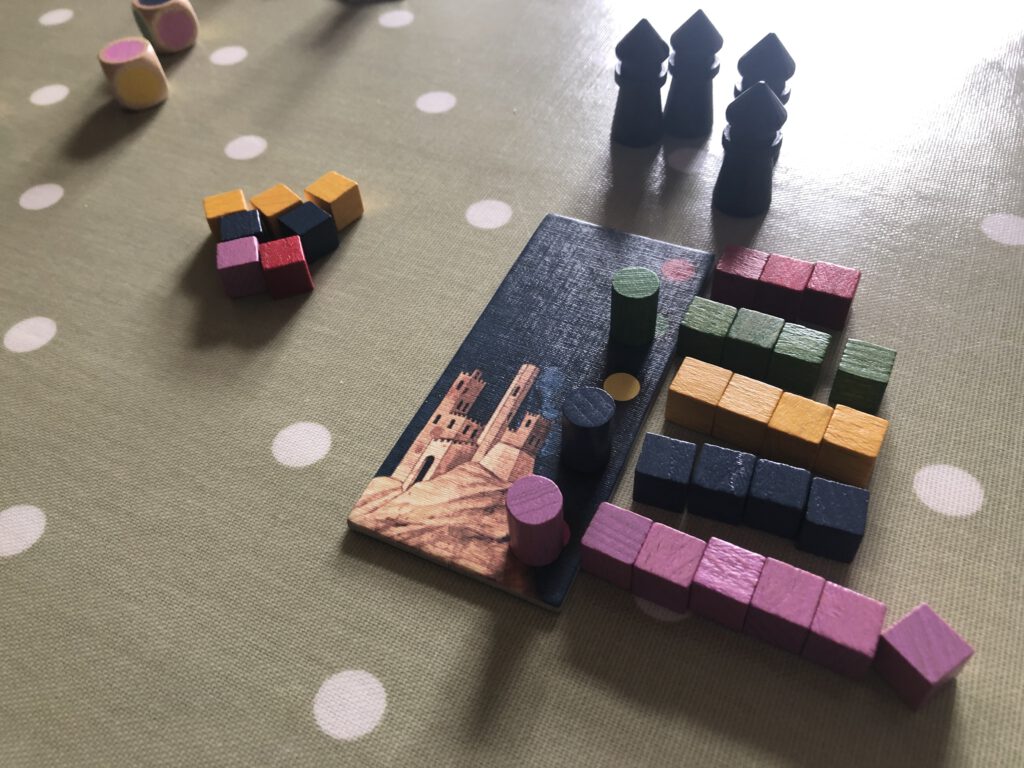 Carolus Magnus is a curious game: a race to build towers, but the ability to build towers at the mercy of what paladins (represented by different-coloured cubes) you control. (The game is recently reprinted as Eriantys)