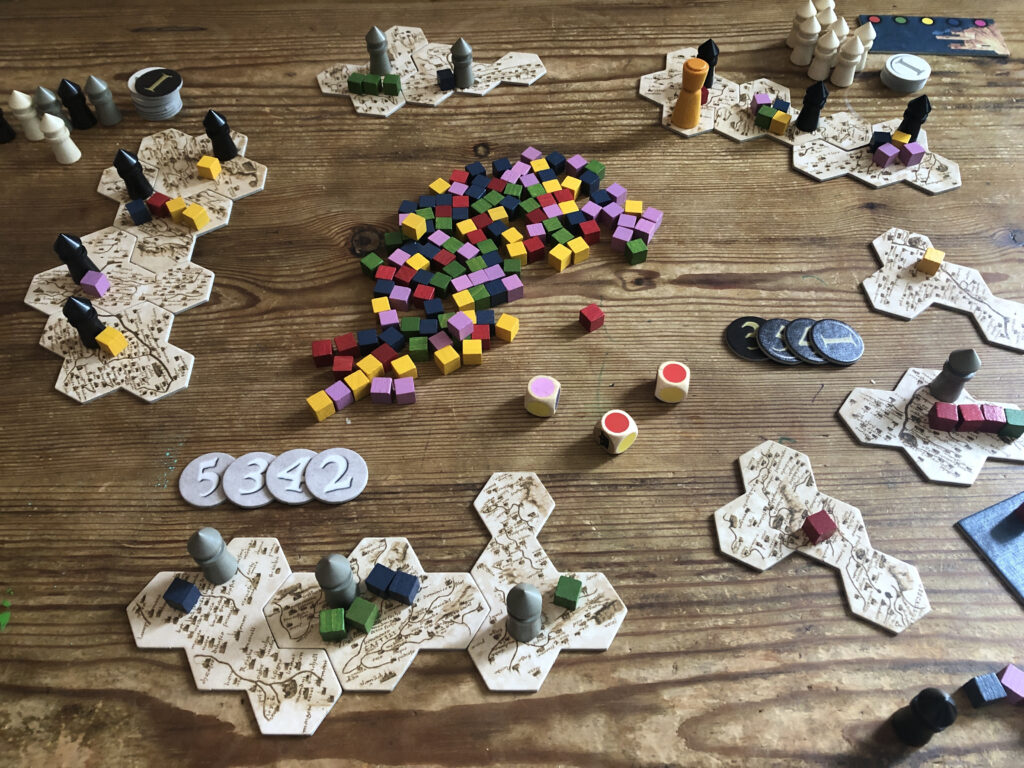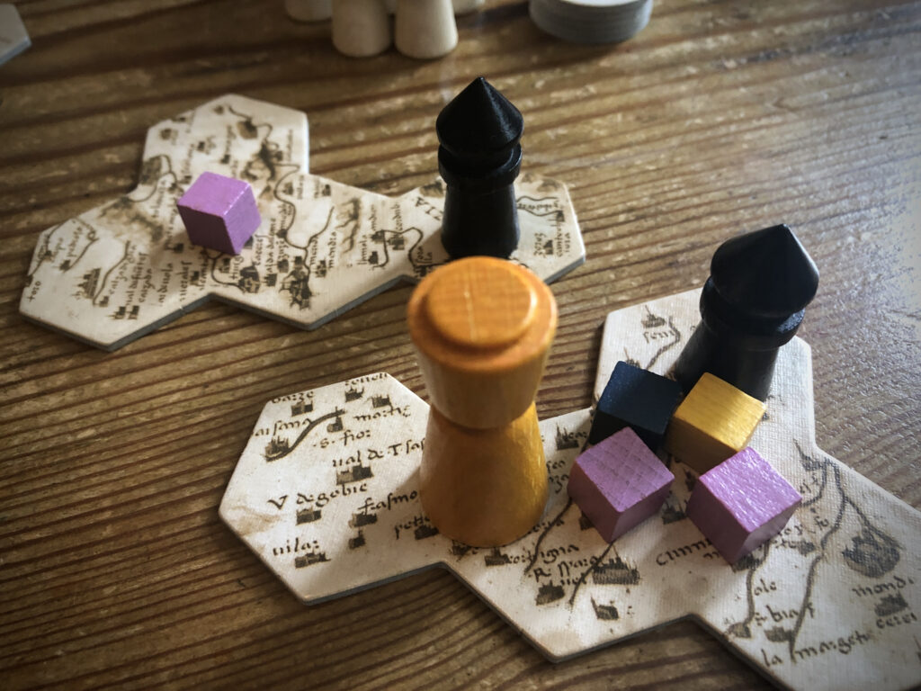 If the emperor stops on a territory you control, you can build a tower there. If it stops on a territory you have a tower on but you no longer have control of the paladins present, your tower is ejected and whoever controls the territory builds a tower there instead! In either event (or indeed when nothing happens because there is a tower present and control hasn’t changed hands) you roll three dice to top up your stock of paladins/cubes, and then it’s the next player’s turn. If you were last to play, then the player who played the lowest token previously is first to play a token this time.