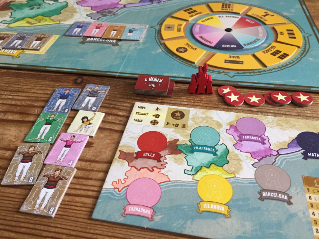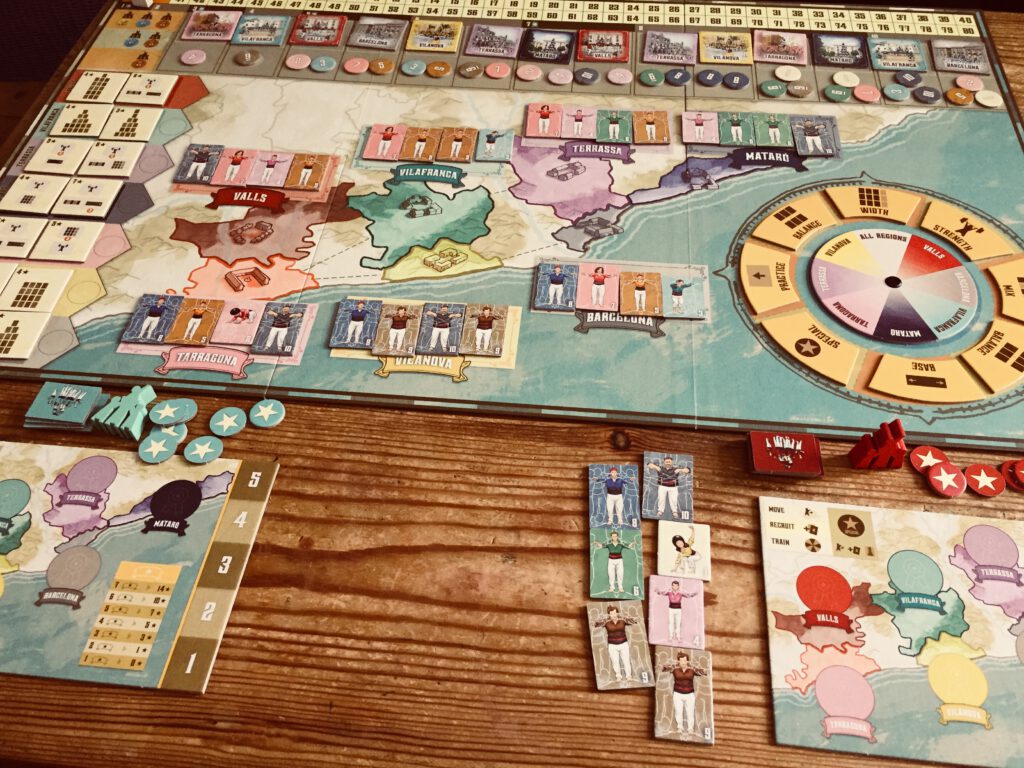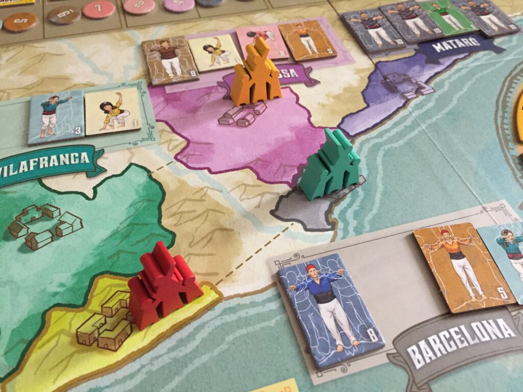 At the end of rounds 3-10 one or more regions will call for a performance so if you’re in that region and can meet the requirements (for instance, Barcelona might only accept a castell where there is strength and width) you can perform. You can also pick up additional points by putting on an impromptu local performance in a region (what each region likes is, again, visible on the board)