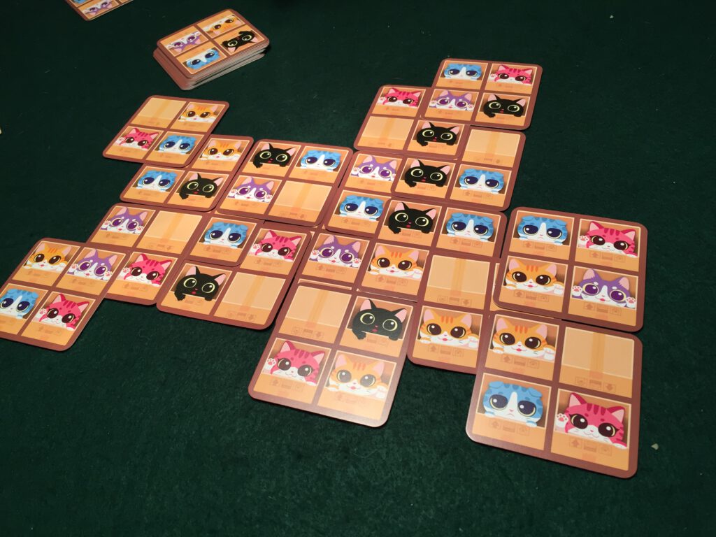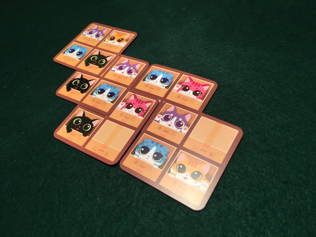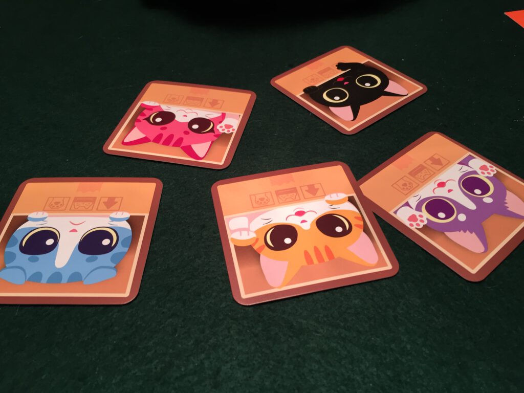 What you’re trying to do is twofold: have the most cats showing of your assigned colour (your secret identity) showing when the cards run out – every cat is worth a point – and also have the biggest grouping of same-color cats, as the biggest group of all the players also scores an additional point per cat. If your secret identity is the chiwawa, you’re trying to maximize the empty boxes.