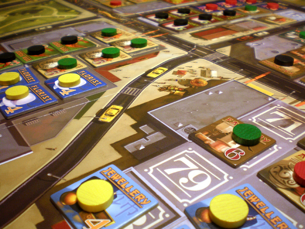 And then the fun begins. Players trade business tiles, plots they own and money in any combination with each other. The idea is to get adjacent plots, and tiles of the same type of business, because each business needs a certain number of tiles to be complete. After a few minutes the frenetic trading dies down, and players are free to place any business tiles they now possess onto plots they own. Businesses then pay out – completed businesses pay extra, and a new round begins.