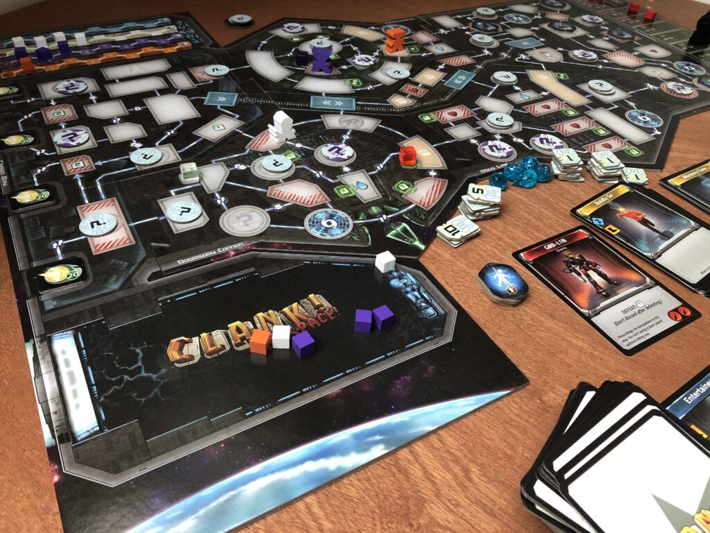 The board has a random set-up but always represents a spaceship: players start at one end of the ship and must make their way to the other in order to steal one of the (six) available artifacts. There are things to help as you go, such as secrets to be found in various locations, gifting you with extra movement, health or points. But there are also things that hinder you, such as monsters and the titular clank: the noise you make as you travel around, arousing the attention of the boss monster. Clank – represented by cubes of individual player colours – is collected on the board. At certain moments, the accrued clank gets thrown in a bag and several are drawn out: if they are your colour, you take damage to your health: if your health reaches maximum damage, you may be out of the game (it’s possible to still score if you’re back in a safe part of the ship)