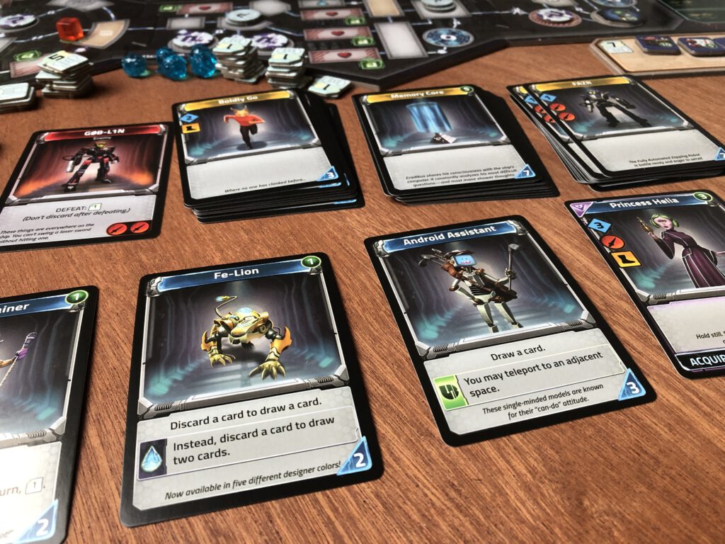 There are several artifacts, and the more valuable ones are tougher to get to. On a turn by turn basis, though, Clank’s very simple: you draw five cards from your deck and spend them in whatever order you like, referencing the symbols on the card: Boots are for movement. Swords are for battle (some paths contain baddies and having swords prevents you from taking damage). Experience is for getting more cards, which is really the juice of Clank: everyone is continuously improving their deck from an available display of face-up cards on the table: more and better numbers and individual card actions. In addition to that, there’s also money to be had from defeating monsters: and if you’ve got money, you can go to a market space in the ship and buy helpful things, such as a skeleton key that gets you through otherwise-inaccessible passages, or the vortex pass to use the beam-me-up style movement from place to place, instead of being beholden to geography. BUT! as mentioned above, certain things trigger the boss monster to attack, such as code-cracking and artifact removal. As the game ramps up so these attacks become more frequent, and more powerful, meaning everyone faces a dilemma: get a cheap artifact and exit quickly, or push your luck and go for a better one? When the game ends, all survivors compare wealth from artifacts, market items, upgraded cards and money: the most wins!