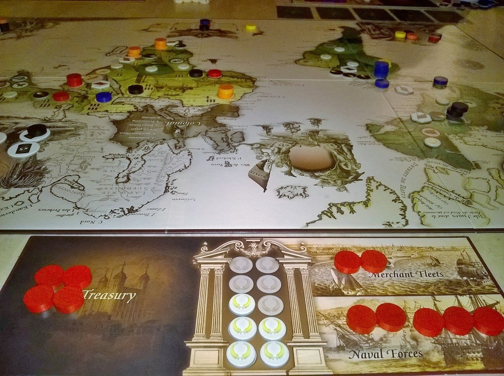 Finally in the four corners of the board are the Progress tracks – you can pay money to move up on these and make your Economy, Seafaring, Navy and Logistics problems easier to negotiate by creating better infrastructure in them.