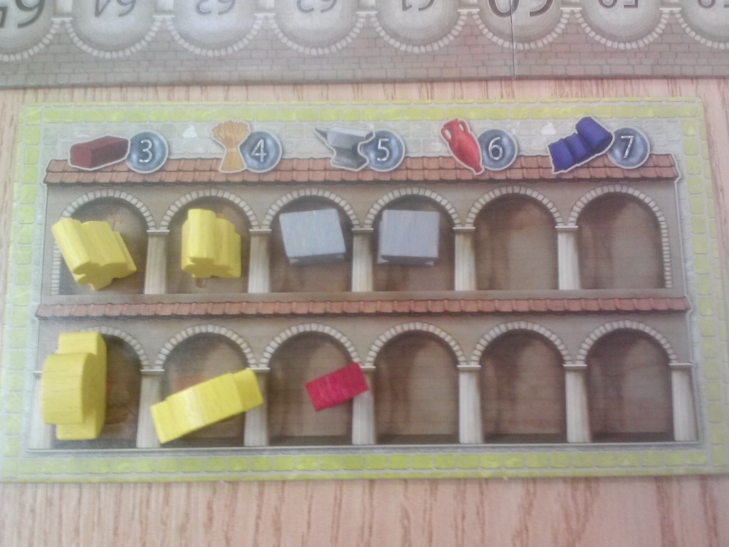 At the end of the game the little banner at the bottom of every players card comes into play, as these dictate everybody’s scores. Each card has the name of a Roman God on it, and they each have a particular way of scoring points. They might reward having a lot of colonists, or having built houses in a lot of regions, or houses in a particular type of city. There are six Gods and really, the key to winning is to keep an eye on what cards you purchase during the game – focussing on one or two of them is more likely to reward than a smattering of everything!
