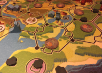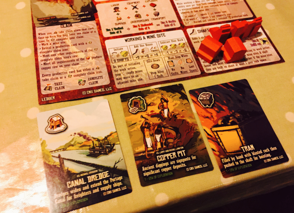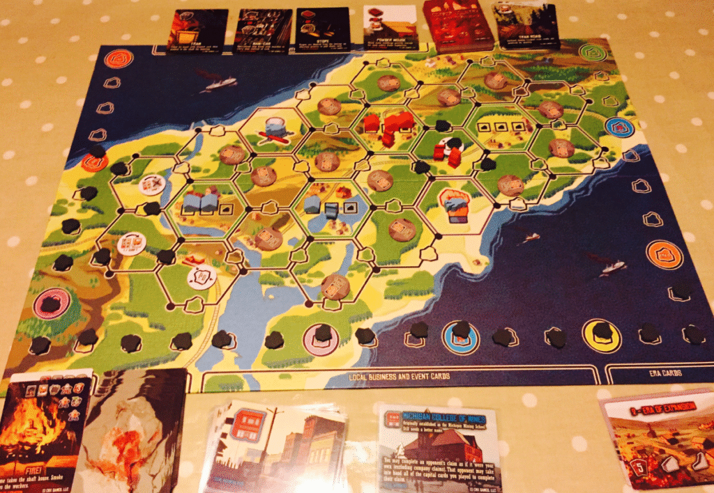 The board shows Michigan’s Upper Peninsula, broken into hexes in which you will set camp and mine for the precious metal. Each player has a personal board where they keep their miners and buildings that will assist them. It’s also a place you collect your copper harvest.