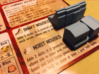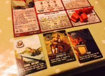 You can use a labor action to get resources too; but more likely you’ll be getting down to the nitty gritty of the game – moving your miners and digging for copper. Your miners and buildings dictate how much you can mine for (- how many Production cards you can flip over) but this is countered by the by-product of copper mining: poor rock. The longer the game goes on, the more this stuff clogs up the mines and gets in everyones way, necessitating the building of shaft houses and hoist houses.