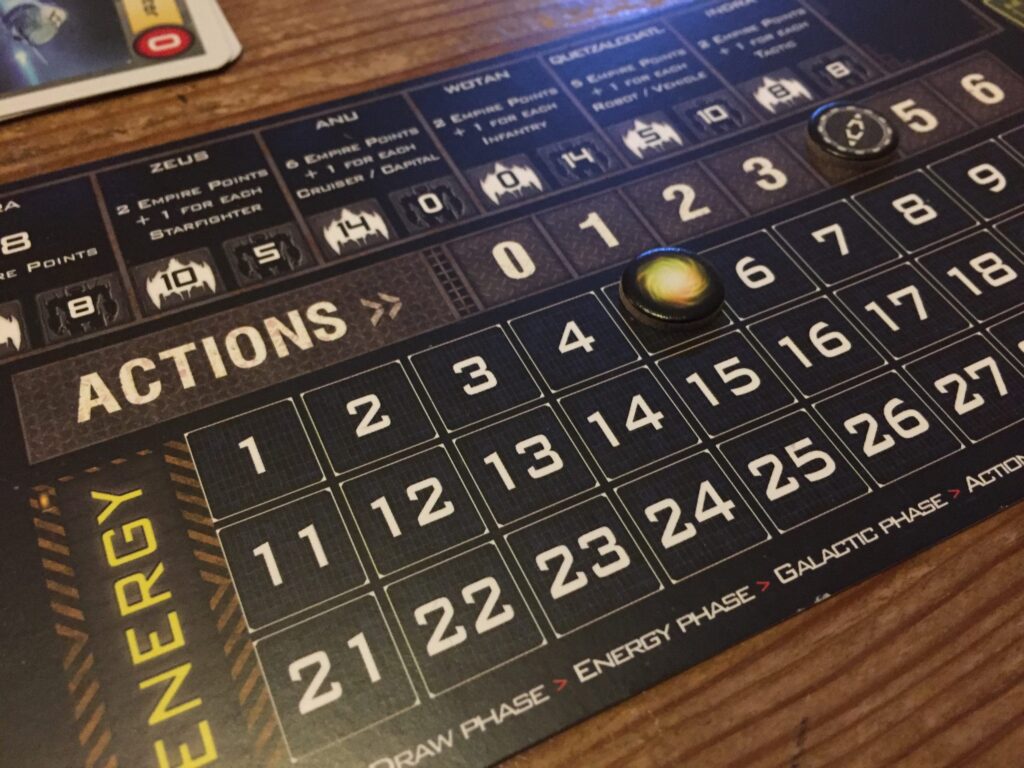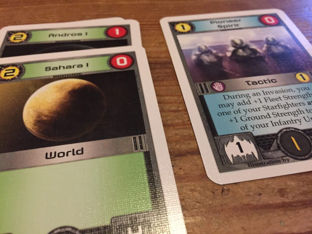Everyone begins with one Homeworld card face-up on the table (your war zone) and an individual player board to track your available action points and energy. The game proceeds through several phases: at the start of each round, cards are added to the central area. These are available to the players (at a cost) and the cards become more and more powerful as the game nears its end. Players then generate energy from their planets, before spending their available action points (everyone has the same) and energy to play units from their hand to their war zone, use said units to invade a world in the central area, or purchase a tactics or unit card from the central area and put it into their discards – when your draw deck runs out, your discards are shuffled and become the new draw deck, so you are looking to improve your units and tactics cards whilst not neglecting to invade worlds in order to boost the precious energy – without energy, there’s very little you can achieve!