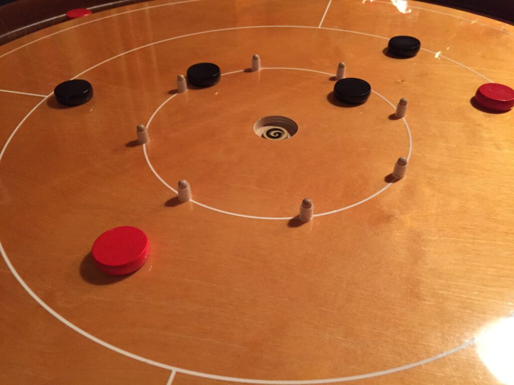 There’s no one defining board as lots of companies produce them and many crokinole boards are home-made. They come in various shapes and finishes, with the one constant being the polished finish, and the scoring zones.