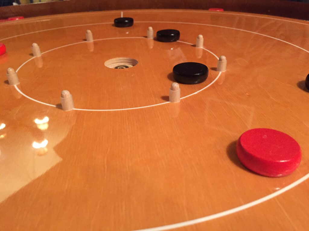 In the centre of the board is the ‘Toad’ – a slightly recessed hole that if you sink your puck into with a legal shot, will score you 20 points. The circular area around the Toad is worth 15 points, and there are several small posts around this inner ring that pucks will bump into and ricochet off. Outside of the post area is a 10 point ring, then finally a 5 point ring closest to the edges of the board.