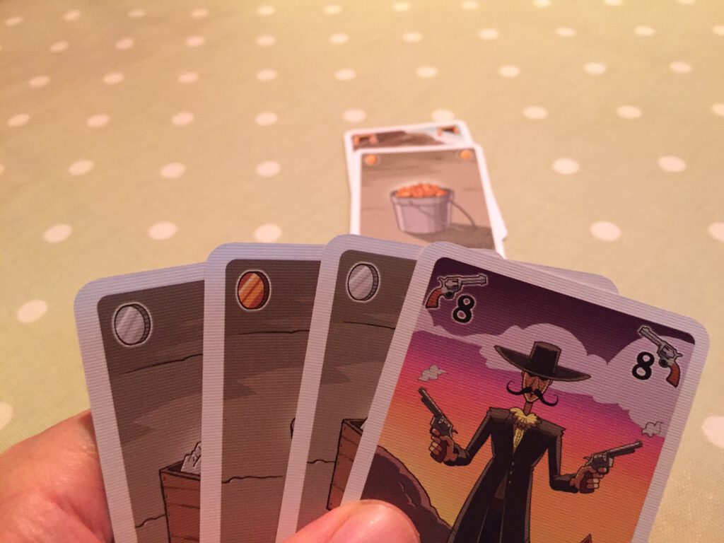 The deck of cards is made up of cards that open mines, cards that ‘find’ the aforementioned metals, cards that close mines (and thus stop the stuff being stolen) and a dozen desperados valued from 1-12.