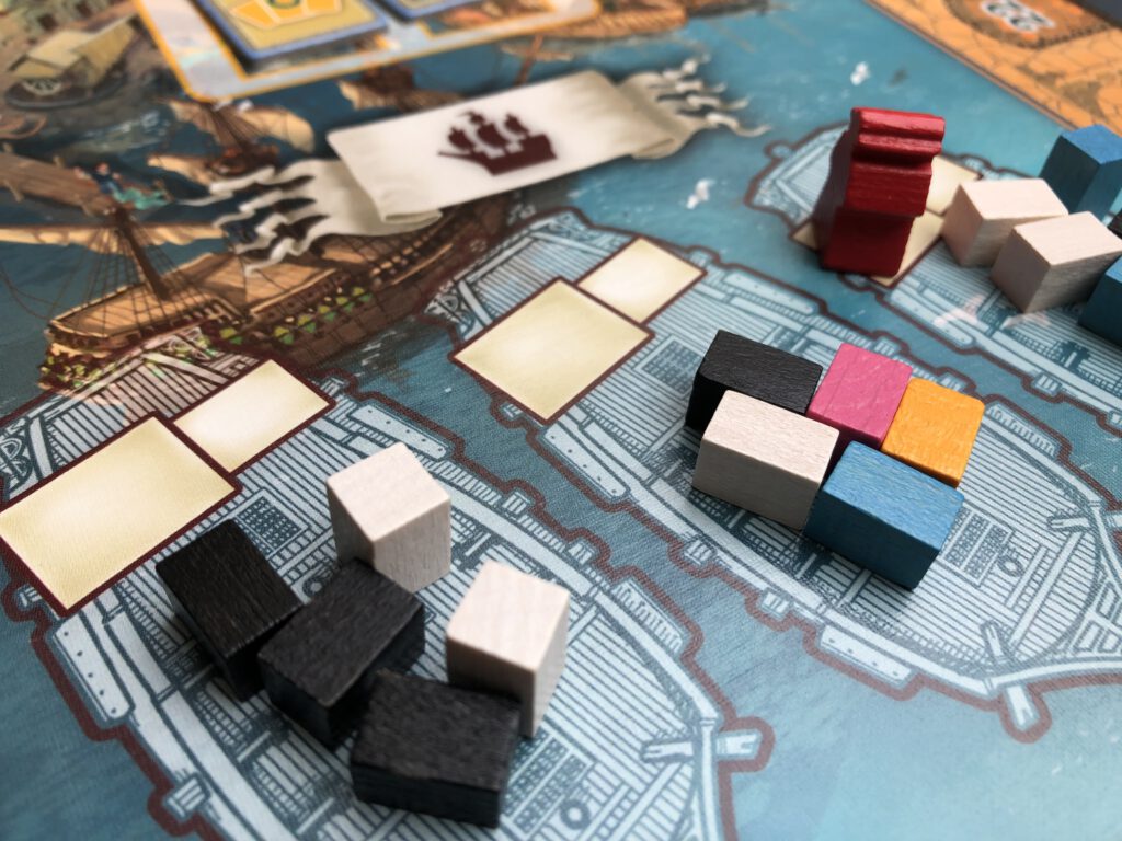 This you-scratch-my-back type operation is replicated in the gathering of goods too. Three ships are loaded with goods at the start of each round, and two playing pieces must be present for the ship to unload. Whoever arrived last chooses how to split the five goods onboard, and the earlier player gets first choice. (Unlike marriage, you can be both the first and second player to arrive on a ship, but there is a slight penalty for doing so, as it’s frowned upon to be so visibly greedy)