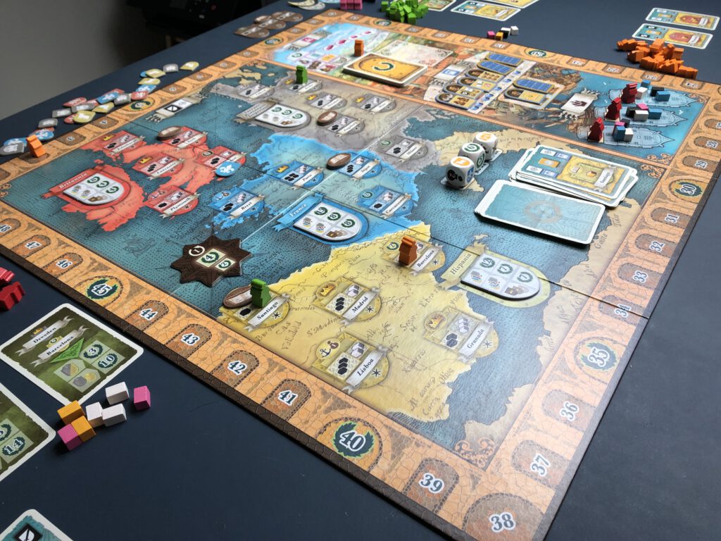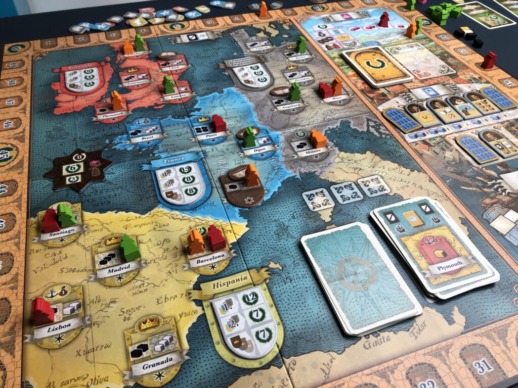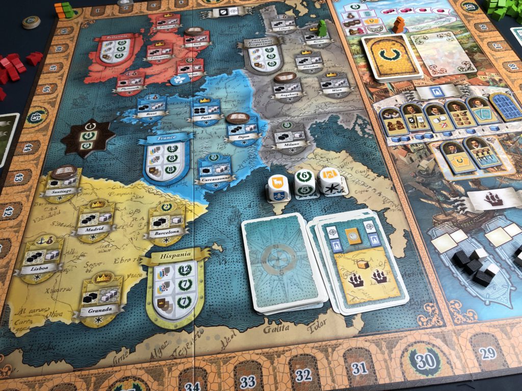 At the end of the first round, players score for their presence on the board, with unmarried Princes and Princesses picking up potentially considerable points. This happens again at the end of the second round, but beware! All singletons will now be packed off to the monastery, probably considered undesirable. This might seem fairly harmless in itself – if you’re not the waif in question – but the loss of your unmarried family members can be damaging for the scoring card objectives you have hidden, which want you to have family members in, say, Paris and Edinburgh. Fortunately the enforced celibacy can be negated: by paying a pink good for each member you want to keep on the board. You begin the game with two scoring cards, but there are also opportunities to pick up (and play, at the end of a round) more such cards during the game, that function in a variety of ways we won’t get into here. Finally, each country scores majorities for the amount of family members you have present, plus the potential for more points if your family is married in each of the crown cities of that country, representing their political clout with the current rulers. The player with the most points wins, and celebrates their lack of empathy and moral compass with the knowledge that though they sold their souls, they did at least get a good price.