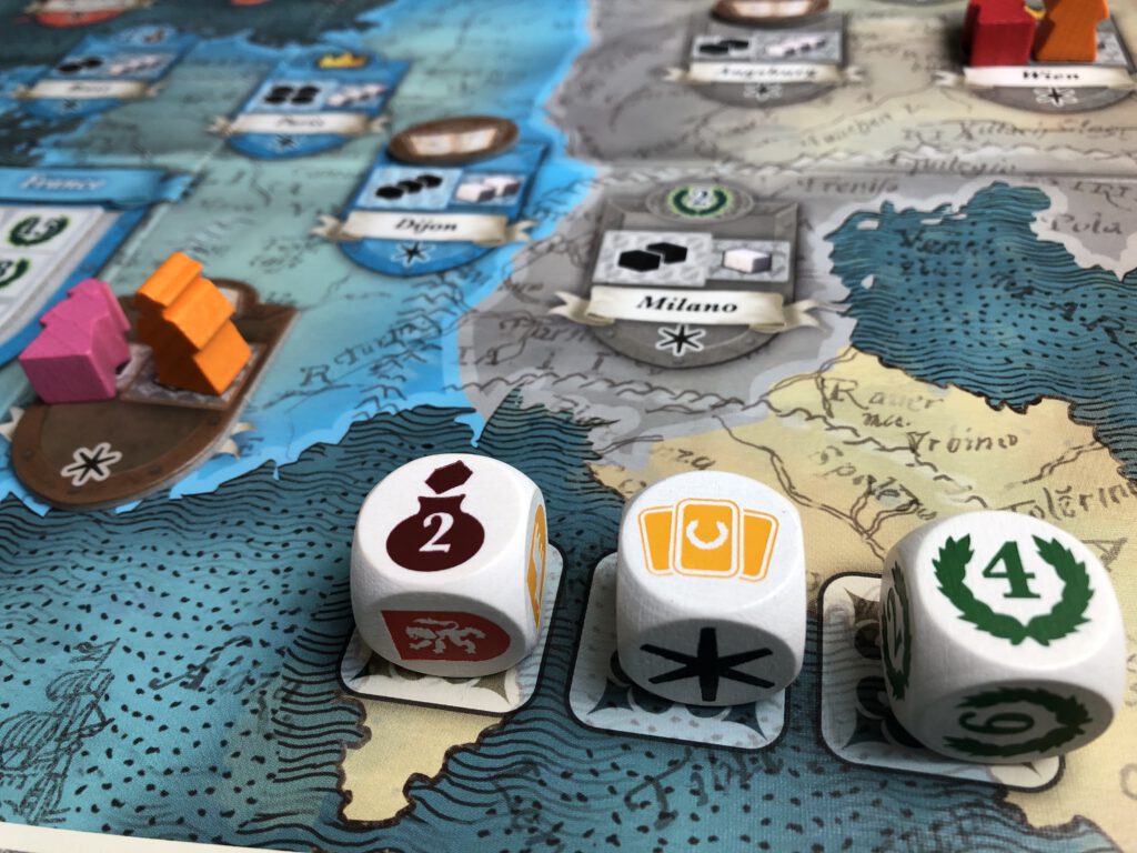But what’s in it for them? Well, when both a prince and duchess are joined together at the same city, they marry: whoever placed the lowest-ranked member of the marriage – and all marriages are ‘ranked’ in this way – rolls three dowry dice (-get stuff!), and divides the results into two dice/one die. The other player chooses their preference and the roller gets whatever’s left. These dowries might more goods, more cards, Scoring cards (more on these in a bit) or simply score you points.