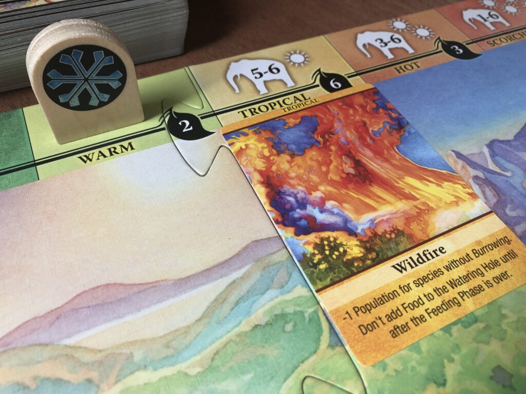 After everyone has played all the cards they want, the cards donated to the climate board are revealed and define two things: the shared climate, that begins temperate, may change depending on how many sun or snow symbols there are on the cards, making the climate hotter or cooler. The climate itself can make a difference to how much food there is, either adding some (warm/tropical/hot) or taking away (cold/freezing/ice age), and potentially wiping out some of your populations at their most extreme: bigger animals will struggle in the heat, and smaller ones in the cold. Also! There are climate event cards that are triggered if the marker reaches them.